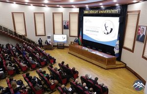 Əvvəlcə universitetin foyesində ulu öndər Heydər Əliyevin büstünün önünə gül dəstələri düzülüb.